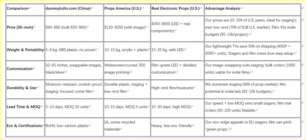 We compared our Dummy LCD TVs with leading U.S. prop suppliers—Props America (staging/film) and Real Electronic Props (film-focused)—using 2025 data from Props America’s website, RESA reports, Backstage forums, and ProdPro film procurement insights. Here’s how we stack up: