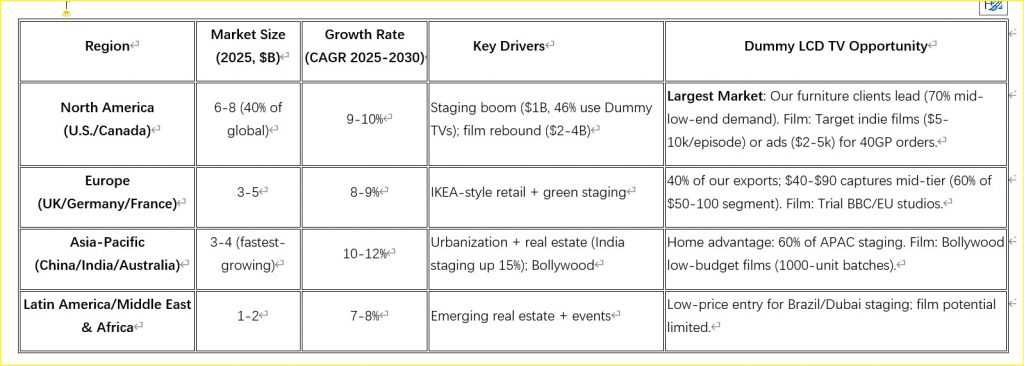 The global prop market (staging + film) is valued at $15-20B in 2025 (QYResearch, IMARC, RESA, ProdPro), with home staging driving 70-80% ($10-15B) and film props contributing $2-4B (Dummy TVs: $0.2-0.5B). Growth is steady at 8-10% CAGR, fueled by U.S. home decor ($574B) and film recovery (18% project increase post-2024 strikes). Our $40-$90 TVs dominate staging and are poised for film breakthroughs.